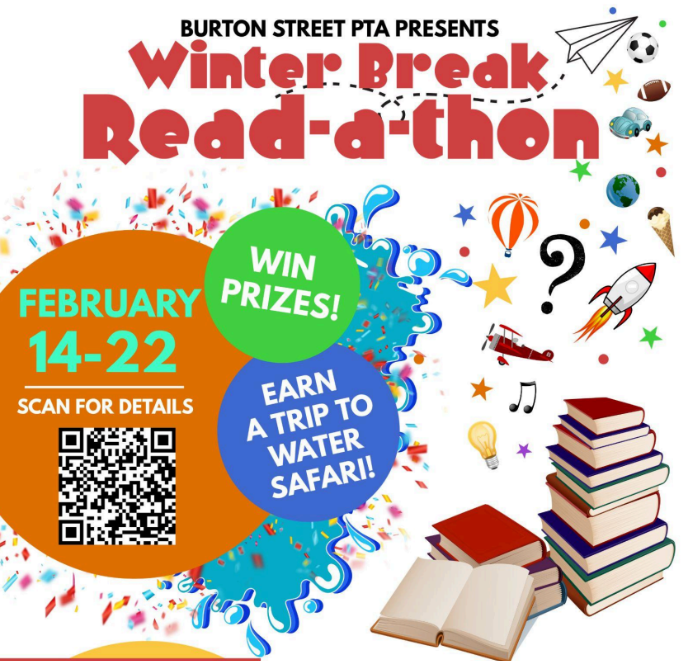 The Burton Street PTA is hosting its 7th Annual Winter Read-A-Thon during the upcoming February Break! For nine days (Feb 14 - 22), we are encouraging your child to read at least 20 minutes a day. All students will be eligible to earn prizes just by submitting their reading minutes! In addition to supporting your child's education through reading, the Read-A-Thon is also a fun and rewarding way to raise funds for the many activities sponsored by the PTA. Students can ask family and friends to pledge a "flat amount" or "per minute amount" to encourage their reading efforts.